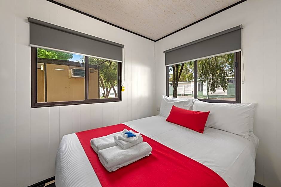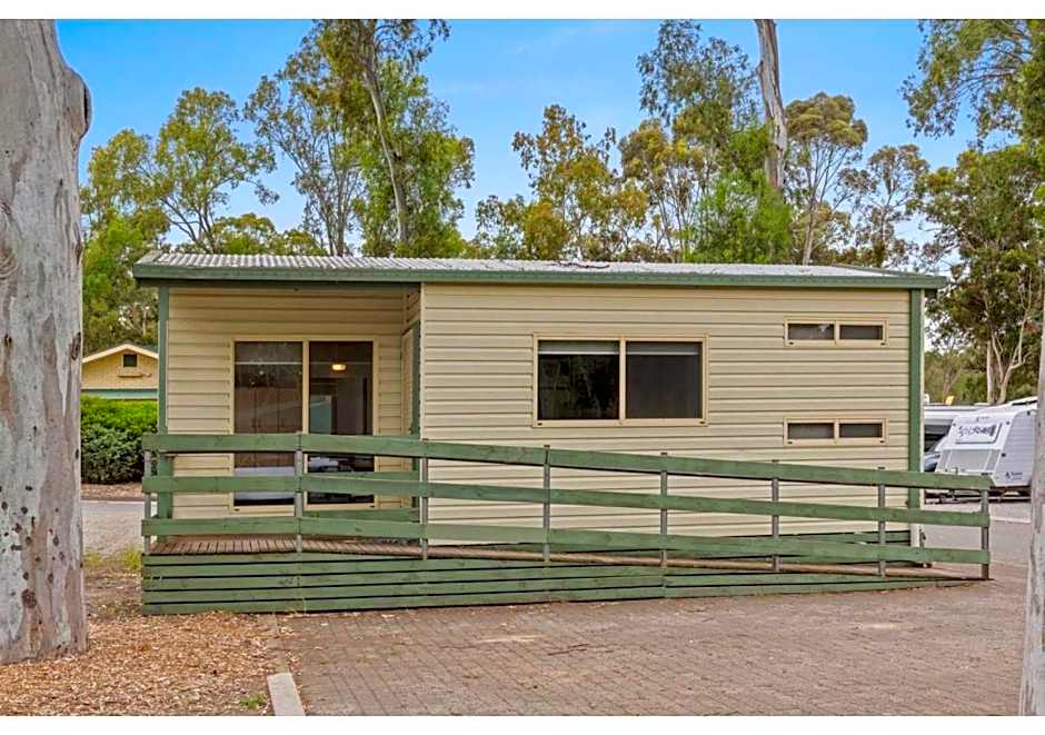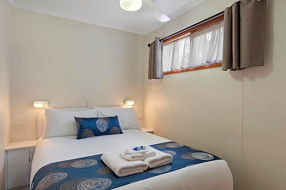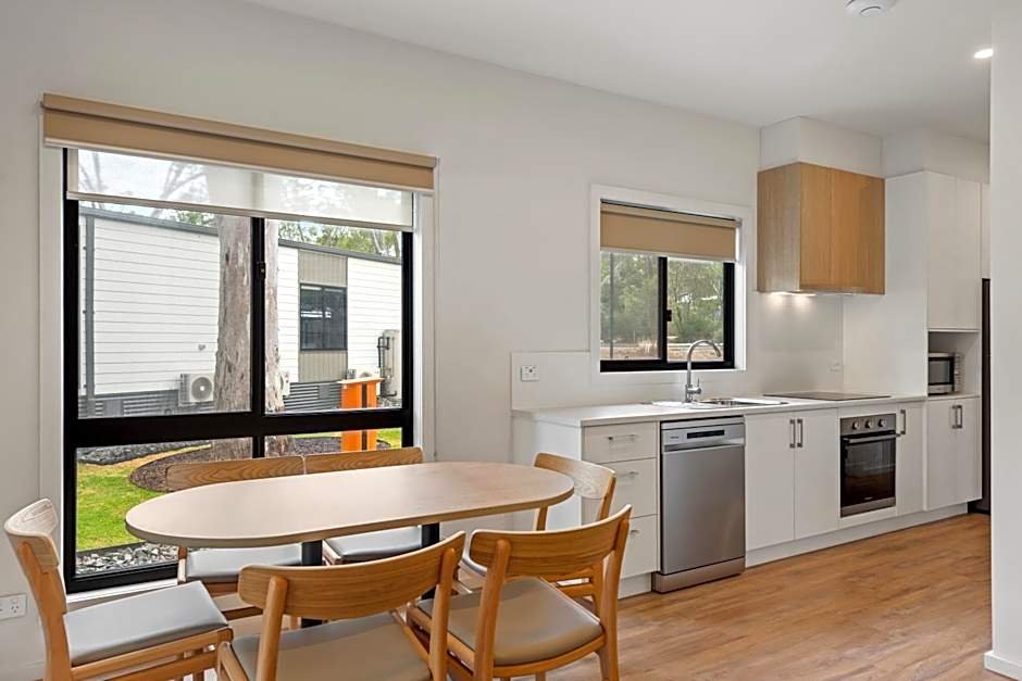 Features a gas stove, full-size refrigerator, TV and DVD player.